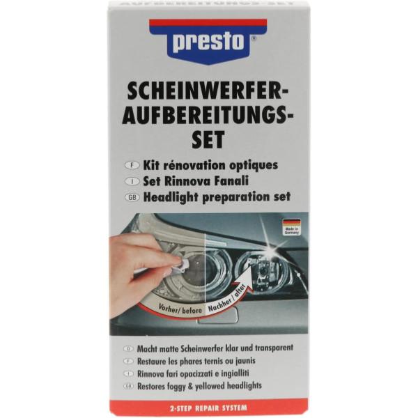 Le kit de rénovation de phares de Presto a été spécialement conçu pour redonner toute leur transparence aux verres des phares de votre véhicule. Il permet d'améliorer la vision et d'augmenter la sécurité lors de la conduite nocturne en éliminant les petites rayures et en offrant une protection UV. Il est à noter que ce produit ne doit pas être utilisé sur des surfaces imprimées, peintes ou revêtues et uniquement sur des lentilles de phare en plastique embuées ou jaunies. De plus, les lentilles présentant de fines fissures ou de la buée interne ne sont pas complètement préparées.